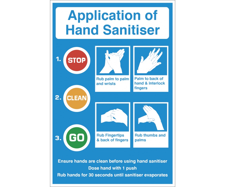 Hand Sanitiser Application Sign promotes good hand hygiene within your premises by reminding people to use the hand sanitiser properly on their hands to minimise the spreading of germs.Millions of germs are picked up in every-day activities. Hand hygiene is essential to prevent the transfer of germs to other people and surfaces. Poor hand hygiene can lead to the spread of Coronavirus, Campylobacter, Salmonella, MRSA, Impetigo and Flu.Prevention of illness through hand hygiene is a high priority in hospitals, kitchens, public restrooms and many other environments. Fortunately, posting Hand Sanitiser signs around your business reminds everyone to follow this practice.Size – 300x200mm.Material – self adhesive vinyl (S/A)