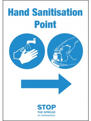 Help Direct your staff, customers and visitors to the nearest hand sanitation point within your premises, to ensure good hygiene is met to help stop the spread of germs & viruses within your establishment.Printed full-colour matt self-adhesive vinyl for instant application to any clean flat surface.Available in 2 sizes -A5 or A4 other sizes available on request